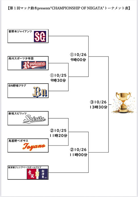 2025/10/24 【学童】第1回マック鈴木presents“CHAMPIONSHIP OF NIIGATA”開催 10月25日26日と『第1回マック鈴木presents“CHAMPIONSHIP OF NIIGATA”』が、村上朝日球場にておこなわれます。 新潟市少年少女大会のブロック優勝4チームに2チーム加え全6チームにて、新潟市の頂点を決める大会となります。 【出場チーム】 曽野木ジャイアンツ 両川スポーツ少年団 BN野球クラブ 新坂スピリッツ 鳥屋野ペガサス 新津東ジュニアベースボールクラブ tagPlaceholderカテゴリ: トピックス, 学童